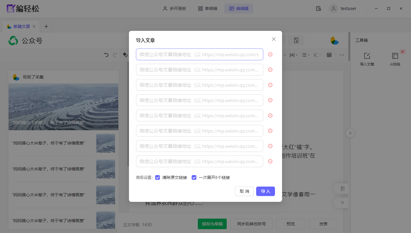 操作路径:编辑器右侧工具箱→「导入文章」→粘贴公众号文章链接 →导入