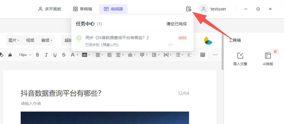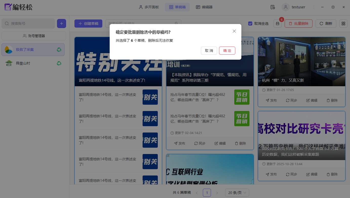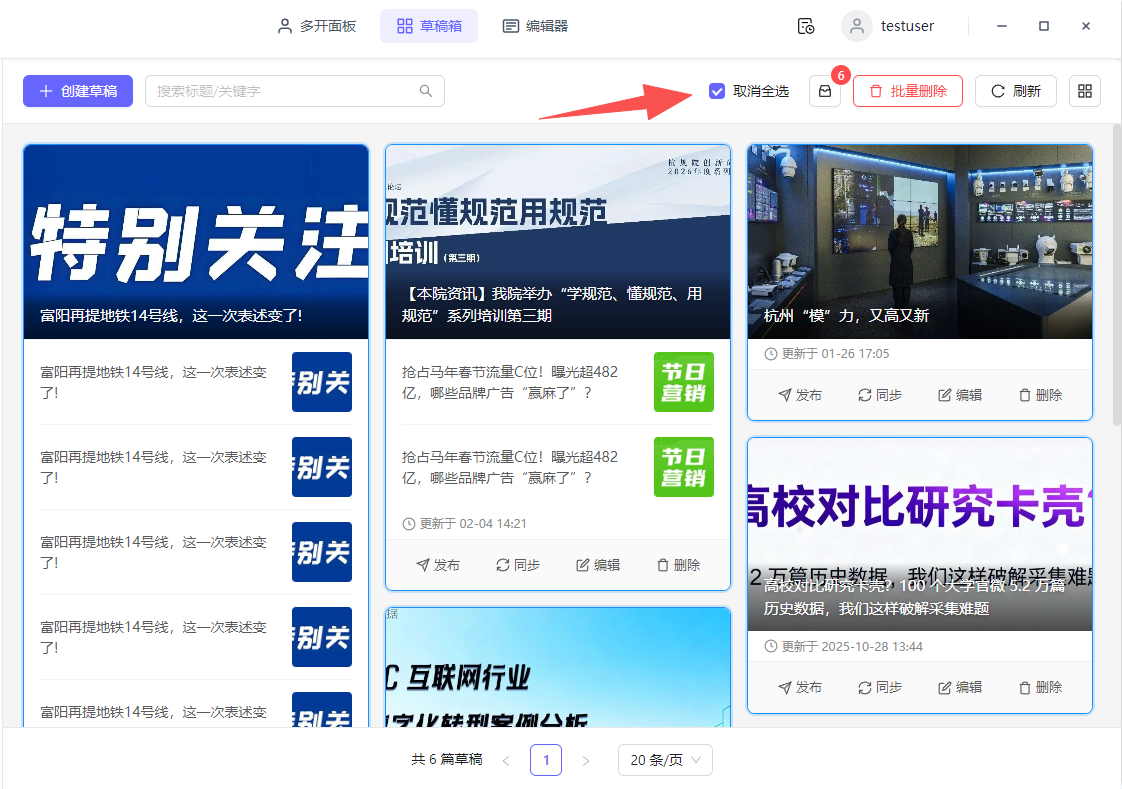 操作路径:编辑器顶部点击→「草稿箱」→全选当前页 →批量删除