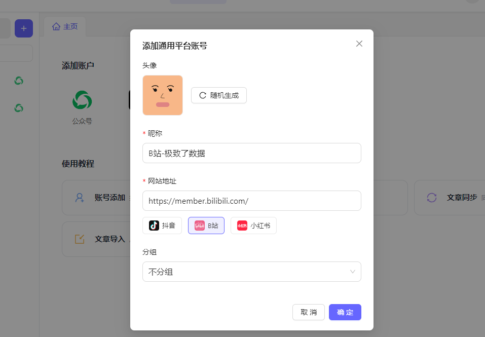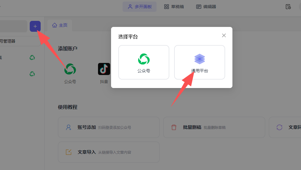 添加通用平台账号: