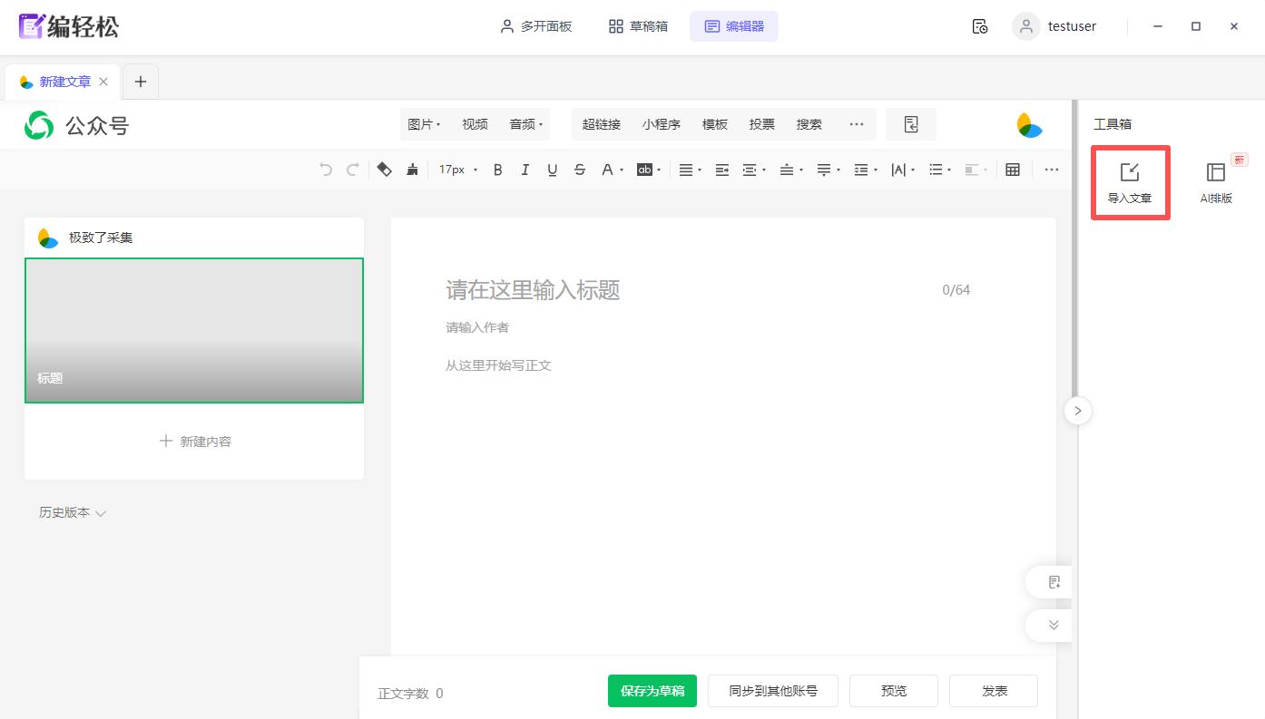 - 使用公众号官方编辑器编辑内容(或使用右侧工具箱导入文章)